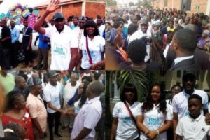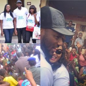 The singer and his wife Annie Idibia arrived the camp in the morning and donated items to thousands of families who had been displaced by flood.