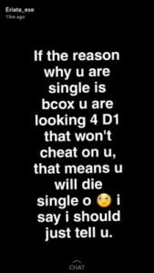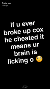 Big brother Naija 2017 fake housemate, Ese Eriata took to her Snapchat to advise ladies not to leave their man only because he cheated.