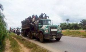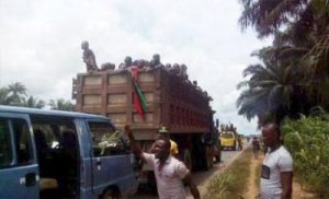 Photos show thousands of IPOB, members in tippers, buses and other cars from different South-East states heading to their leader’s home, Mazi Nnamdi Kanu in Umuhia, the Abia state capital after Nigerian army, again, surrounded Kanu’s home with 10 armoured cars.