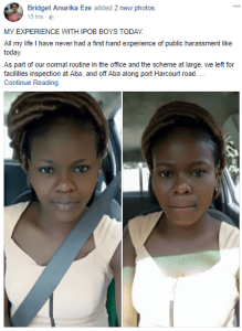A Nigerian lady, Bridget Anurika Eze has taken to Facebook to narrate the humiliating experience she, her boss and others suffered at the hands of touts, suspected to be supporters of the struggle for Biafra.