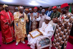 Buhari was decorated with the highest chieftaincy tittle of Enyi-Oma 1 of Ebonyi state from traditional rulers of the state.