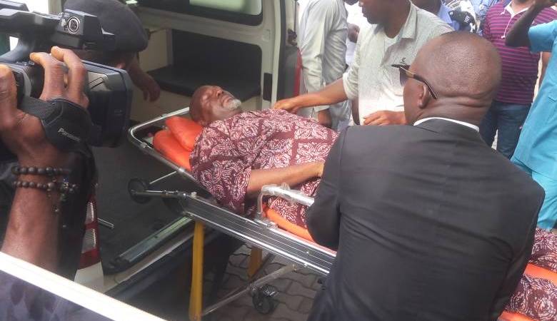 Senator Dino Melaye was on Thursday morning brought into the Lokoja Senior Magistrates’ court, 2, on a stretcher to face charges prefered against him by the Nigerian State.