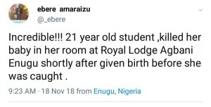 A 21-year-old female student has been arrested in Enugu for allegedly killing her newborn baby in her bedroom at Agbani area shortly after giving birth.