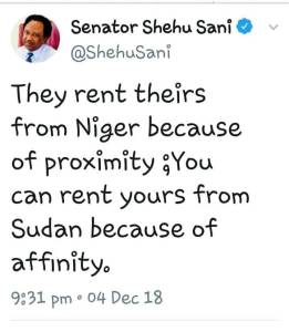 Shehu tweeted, “They rent theirs from Niger because of proximity; You can rent yours from Sudan because of affinity.” – a veiled reference to the rumour that Buhari’s double from Sudan is now the one in charge.