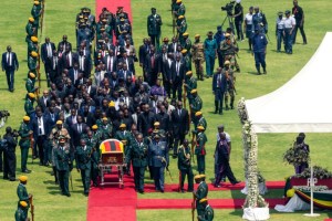 Mugabe’s casket, draped in the green, black, gold and red Zimbabwe flag, was marched slowly into the stadium, accompanied by a military band and an escort of officers. His wife Grace, in a black veil, and family followed behind.