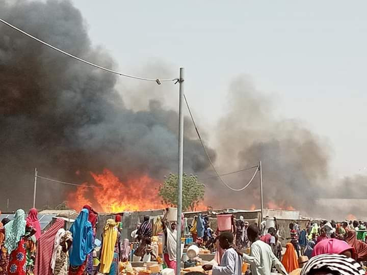 The blaze broke out mid-morning in a camp holding some 70,000 people in the town of Gamboru, close to the border with Cameroon, the head of a government-backed militia told AFP.