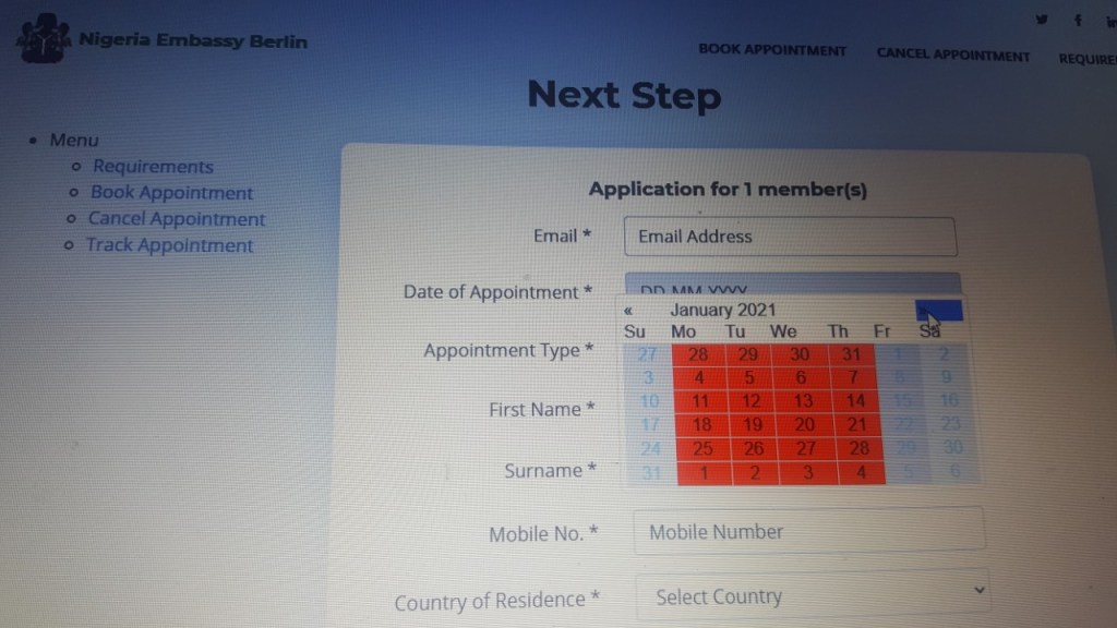 A check at the website site of the Nigerian Embassy lends credence to the allegation. There are no open appointment dates until March 2021. So the question is, how could it be possible? Please see snapshots below: