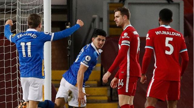 Liverpool’s Premier League title defence suffered a damaging blow as Brighton earned a shock 1-0 win at Anfield, while Manchester City moved three points clear at the top with a 2-0 victory against Burnley on Wednesday.