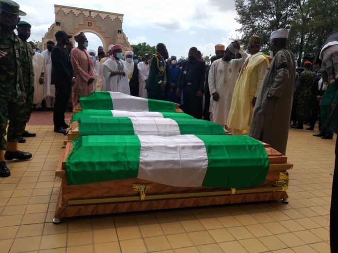 The remains of the late Chief of Army Staff, Lieutenant-General Ibrahim Attahiru, and 10 other officers who died in a military plane crash on Friday in Kaduna were laid to rest at the National Military Cemetery, Abuja on Saturday.