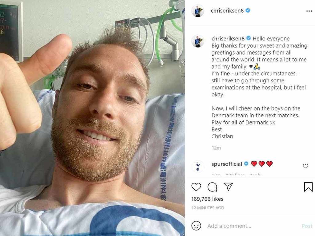 Christian Eriksen, the Danish football player who collapsed on the pitch in his country’s opening Euro 2020 game, said that he was doing “fine” in an Instagram post from hospital on Tuesday.