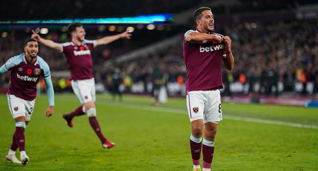 Having scored from their first corner, West Ham’s second nearly brought another goal soon after the interval when Craig Dawson headed against the bar from Fornals’ corner.