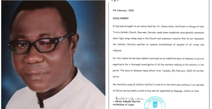 The Parish Priest of Holy Trinity Catholic Church, Ewu-Owa Gberigbe in Ikorodu, Lagos, Rev. Fr. James Anelu, has been suspended for banning Igbo songs and choruses in his parish.
