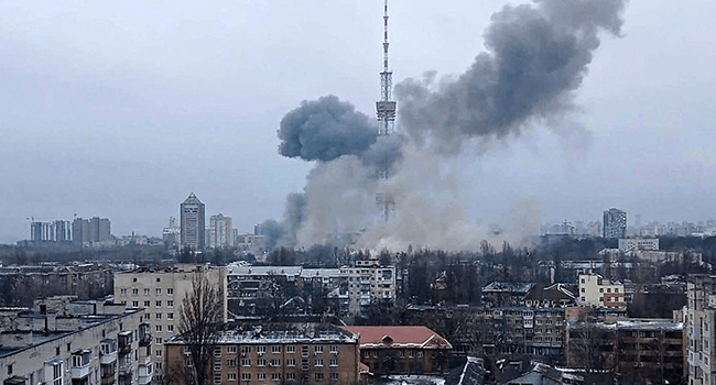 An apparent Russian airstrike hit Kyiv’s main television tower in the heart of the Ukrainian capital on Tuesday, knocking out some state broadcasting but leaving the structure intact.