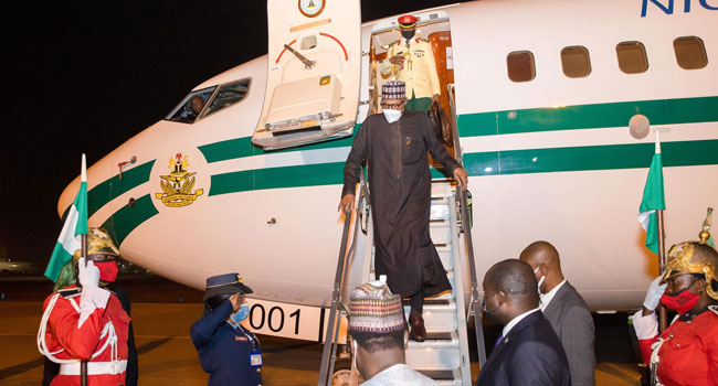 The presidential aircraft carrying the president landed at the Presidential Wing of the Nnamdi Azikiwe International Airport, Abuja on Africa at about 7.09 p.m