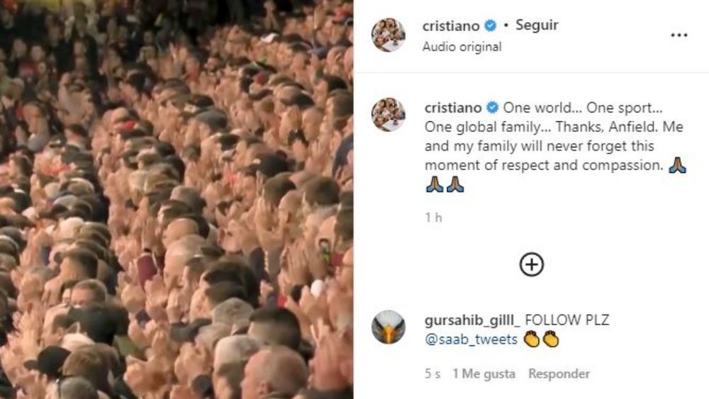 “One world… One sport… One global family,” Ronaldo posted on Instagram, alongside a video of Anfield rising to its feet.