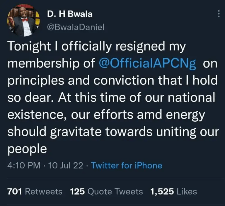 In reaction, Bwala hours later announced his decision to quit the ruling party via his Twitter handle.