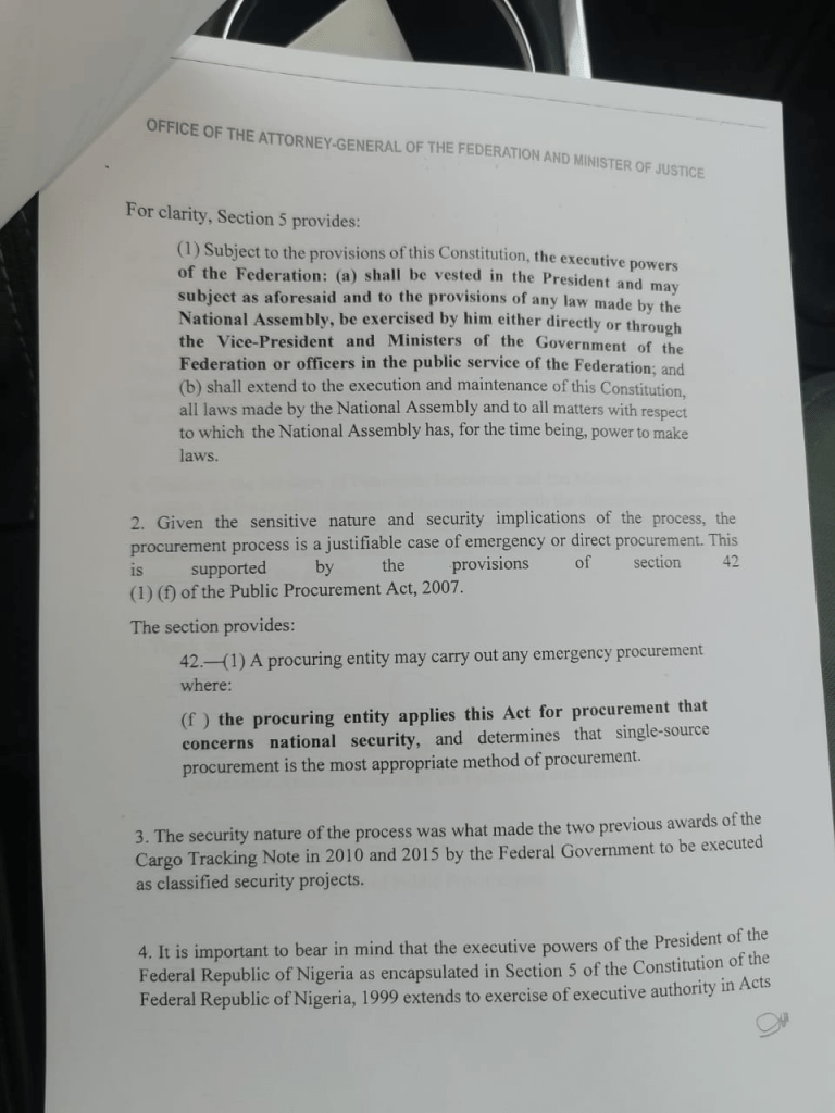 The Ministry of Justice promptly responded on January 11th, 2022, with a clarification that “only the Federal Ministry of Petroleum has the mandate to implement Crude Oil Services.” And that the Federal Ministry of Finance has the mandate for Container Cargo Tracking. In the letter seen by CHECKPOINTCHARLEY, signed by Abubakar Malami, the honourable minister further advised the BPP to “proceed in accordance with the request” from the two ministries.