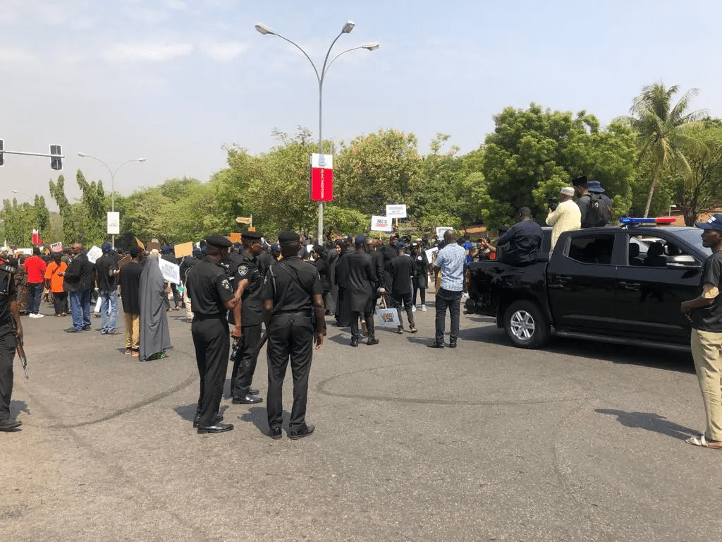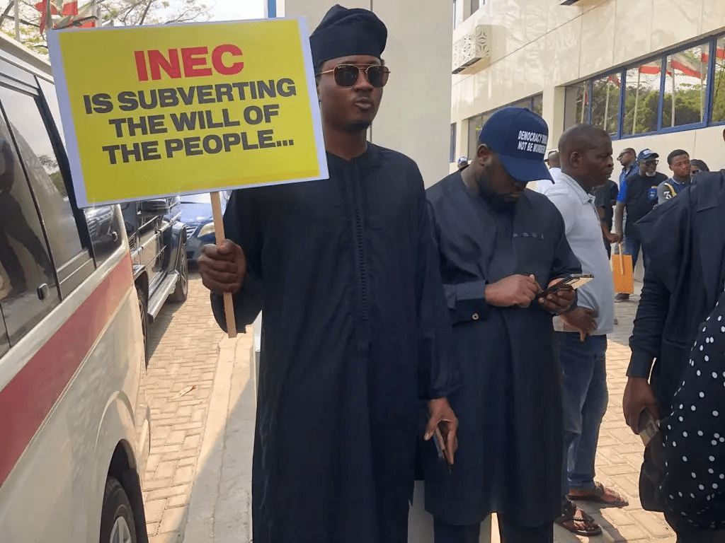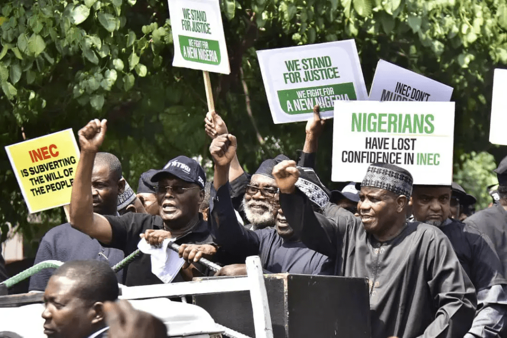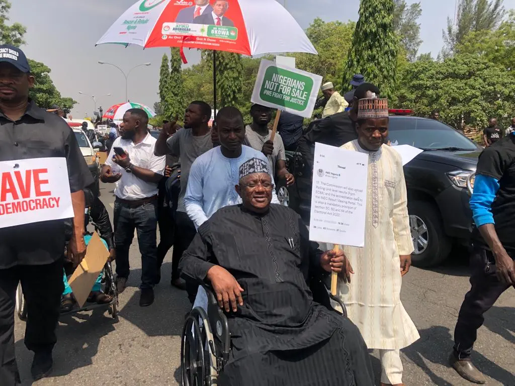 The Presidential candidate of the People’s Democratic Party, PDP, Atiku Abubakar and his running mate, Ifeanyi Okowa are currently leading a protest to the national headquarters of the Independent National Electoral Commission, INEC in Abuja over the outcome of the recently held Presidential election, which many say does not reflect the wishes of Nigerian people.