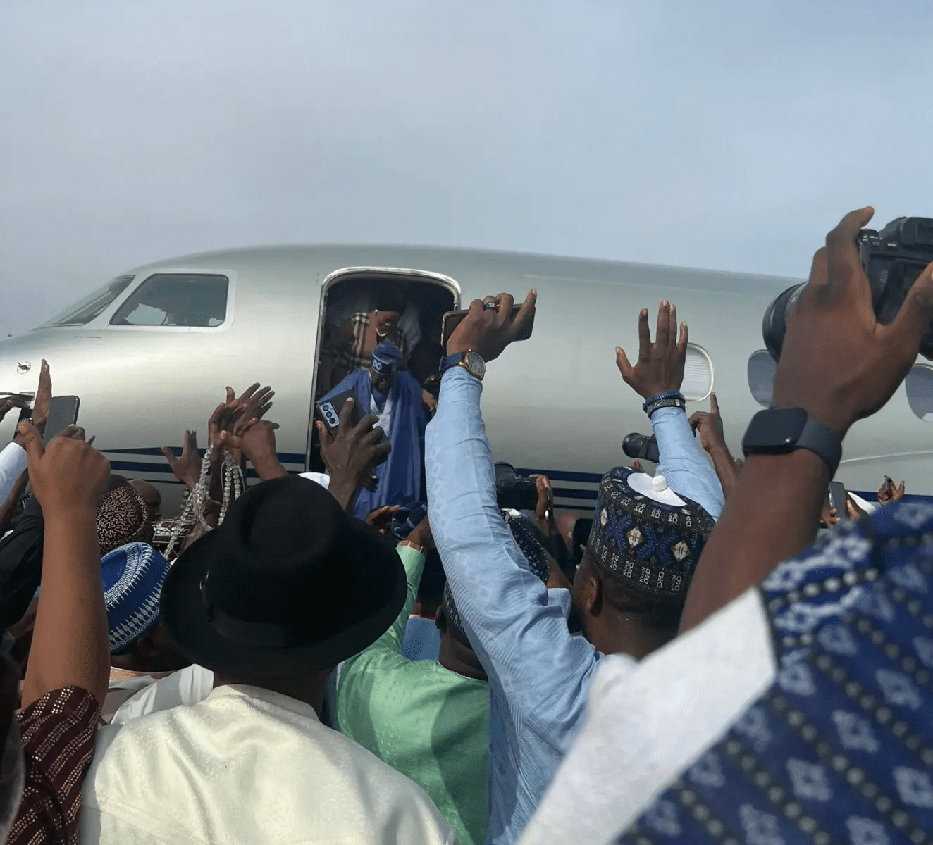 Tinubu’s chartered planed touched down at the Nnamdi Azikiwe International Airport, Abuja as a crowd of supporters were waiting to welcome him and his wife, Oluremi.
