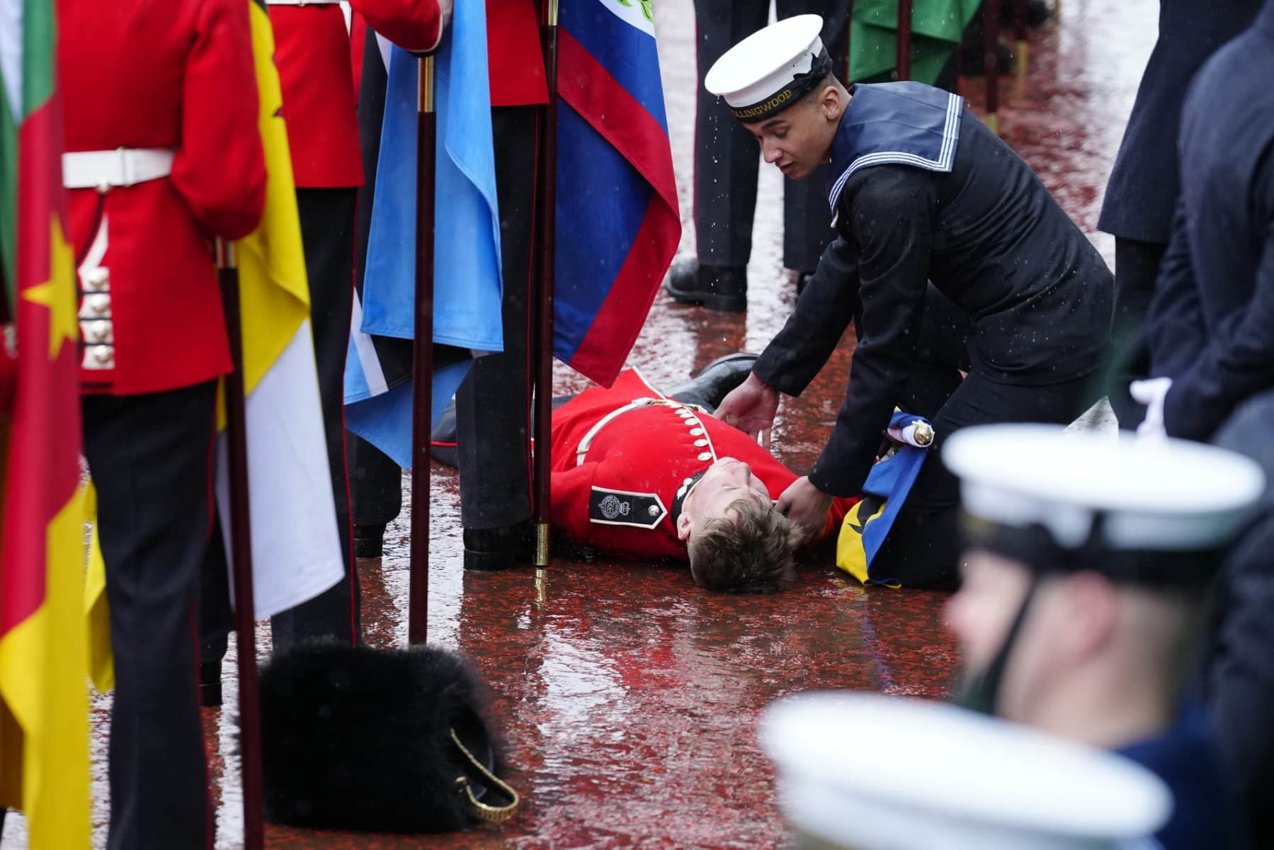 Pictures show the flagbearer dressed in red regalia with pairs of black trousers and black shoes being rescued by his colleagues.