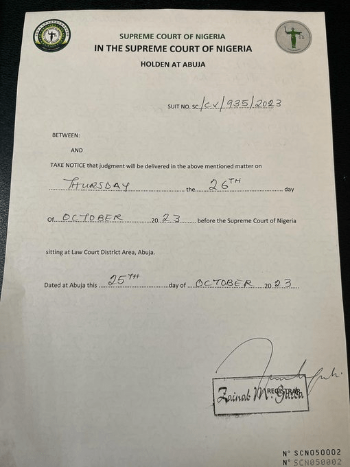 The Supreme Court of Nigeria has fixed Thursday for ruling on the appeals by the presidential candidates of the Peoples Democratic Party, Atiku Abubakar, and the Labour Party, Peter Obi.