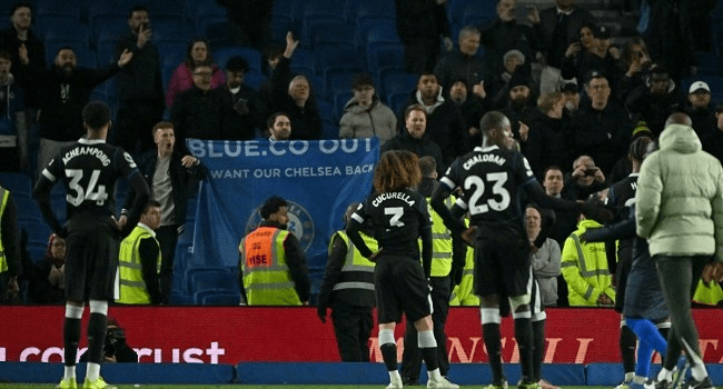 That was the signal for chants against Chelsea’s owners from the Blues supporters packed into one end of the Amex Stadium.